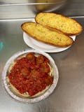 Spaghetti Pasta Toped with Marinara Sauce and Meatballs *Includes Garlic Bread or Upgrade too Garlic Cheese Bread